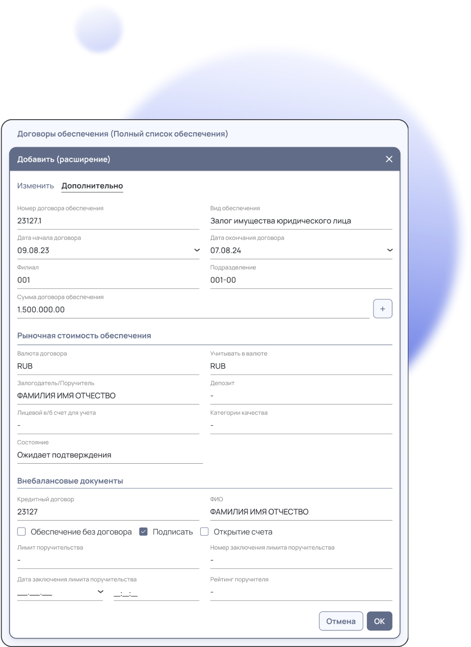 Реализация интеграции между фронт-системами и АБС БАНКА в части обмена данными по договорам обеспечения и залогам.