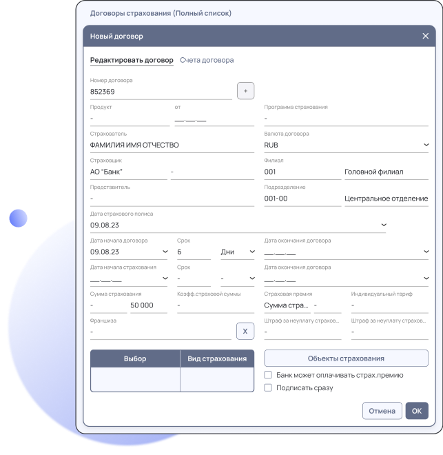 • Реализация функционала по отслеживанию сроков заключения и пролонгации страховых полисов для кредитных договоров с обязательным страхованием.