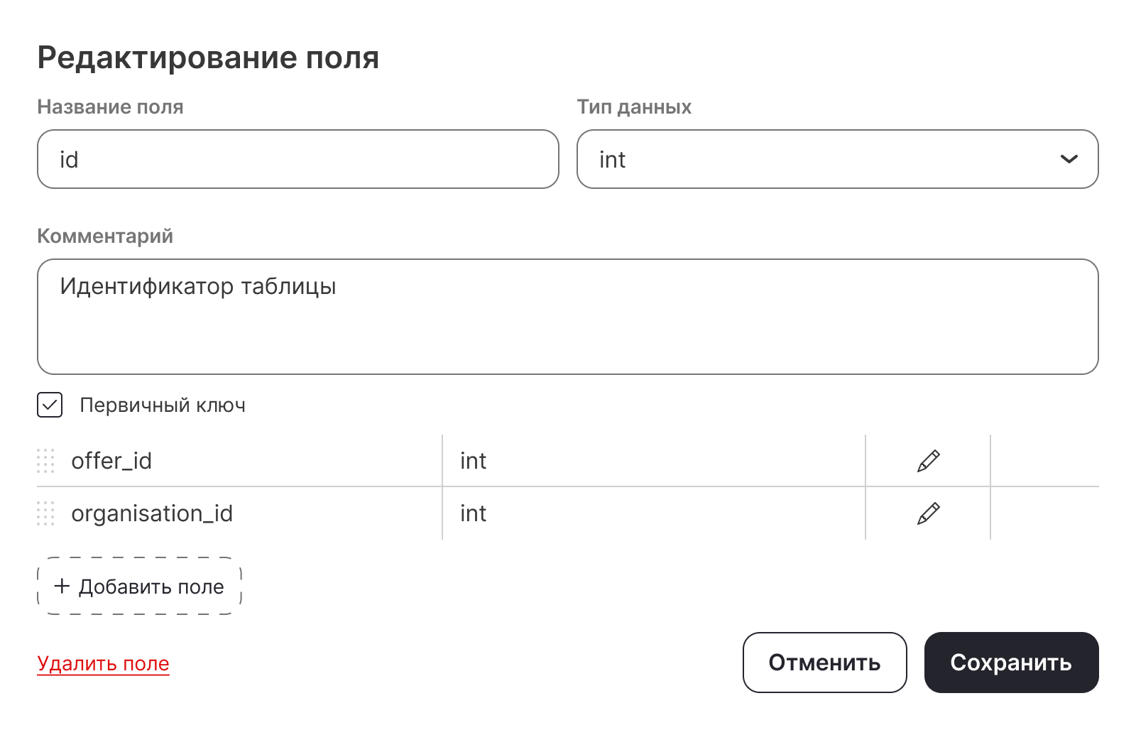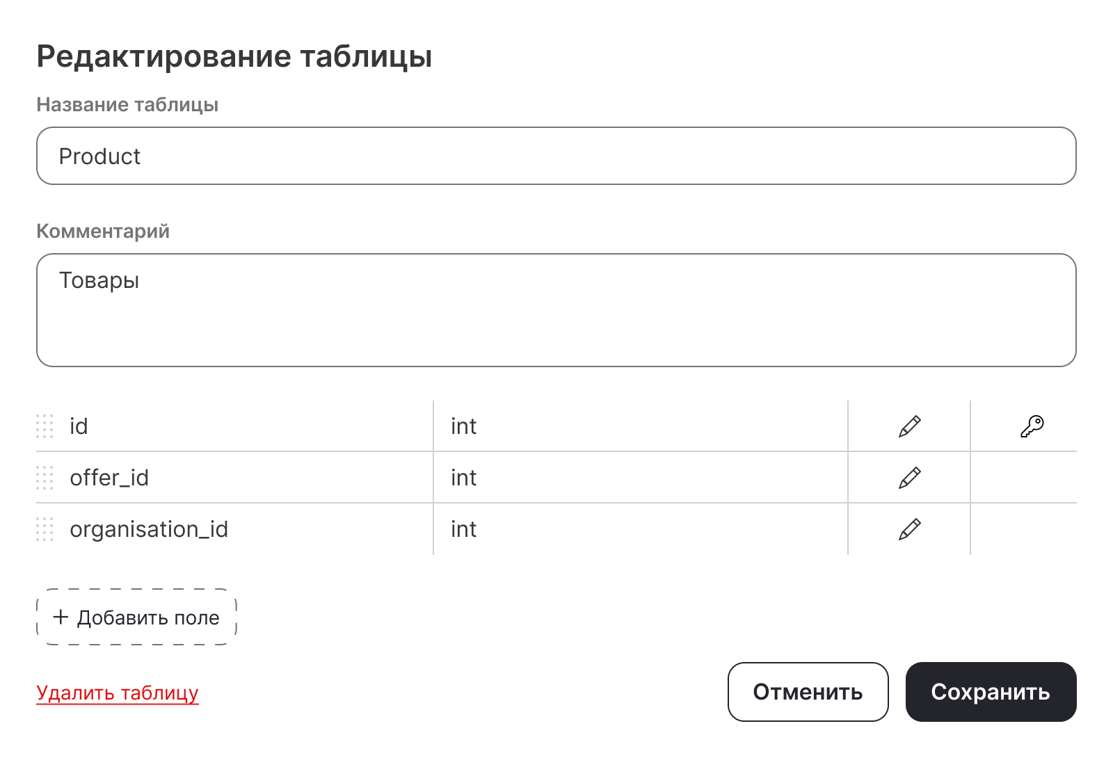 При создании таблицы пользователь добавляет поля, для каждого из которых настраивает параметры и тип данных, которые содержит поле (дата и время, число, строка или логический тип данных).