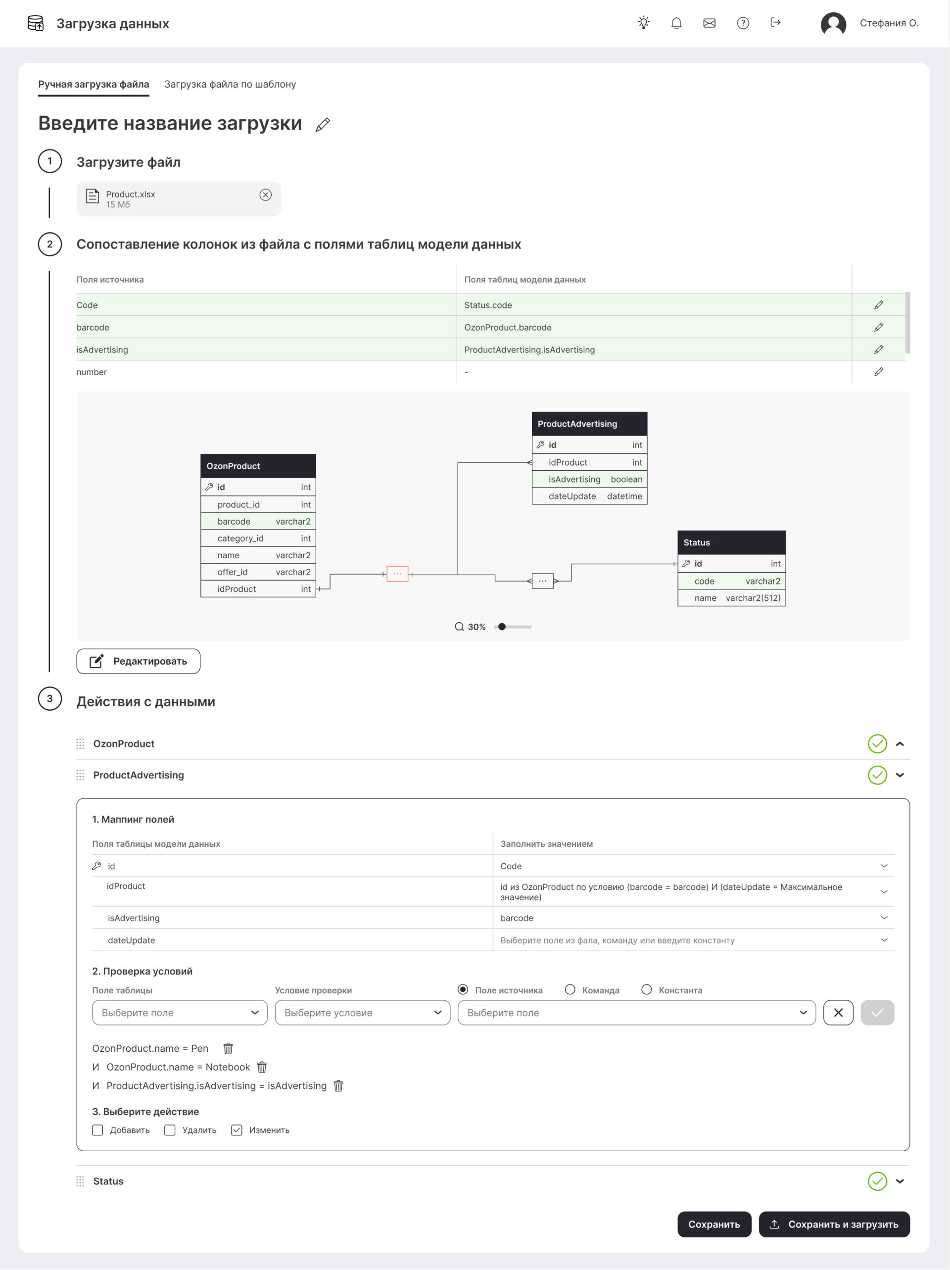 Сопоставляем колонки из загруженного файла с полями таблицы модели данных: на этом этапе можно выбрать, какие именно данные будут загружены в модель.