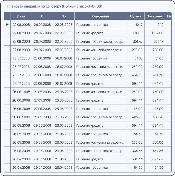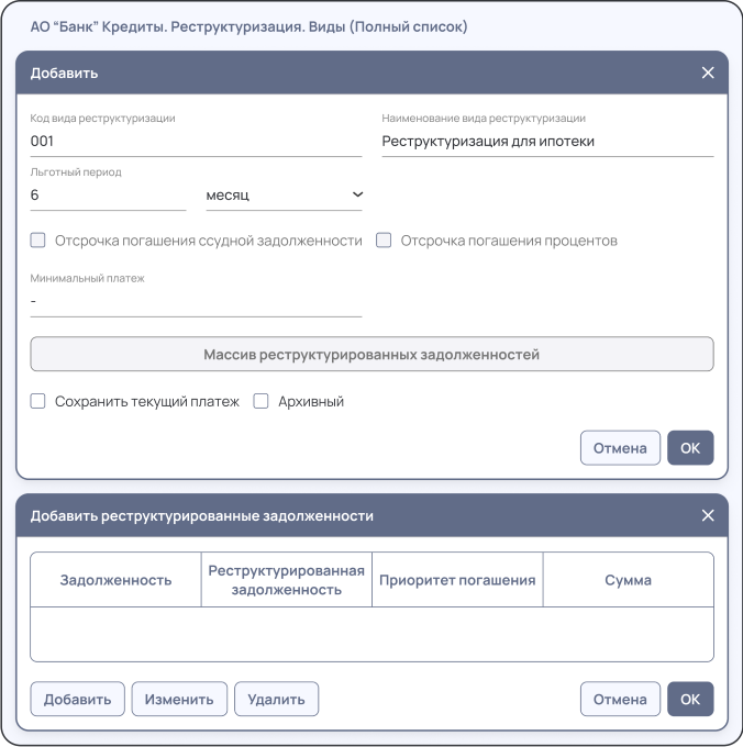 • Реализация функционала по регистрации условий реструктуризациии обслуживанию кредитного договора с реструктуризацией;