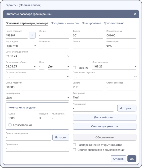 • Pеализация функционала модификации актива в связи с реструктуризацией;